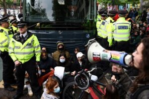 Spread the loveFaith Nyasuguta Protesters in Peckham, southern London, took action on Thursday, blocking a bus suspected to be transporting asylum-seekers to the controversial Bibby Stockholm barge. The barge, chartered by the UK government last year, houses 222 rooms across three stories and is currently anchored off Dorset, a region known for its economic struggles. … Continue reading PROTESTERS IN UK BLOCK BUS TO HINDER ASYLUM SEEKERS’ TRANSFER TO BARGE